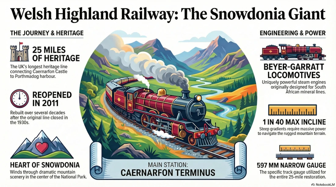 The Welsh Highland Railway (WHR) is a monumental feat of restoration. After closing in the 1930s, the line was entirely rebuilt over several decades, finally reopening in full in 2011. Now the UK's longest heritage railway, it offers passengers an unparalleled journey through the rugged heart of North Wales, using uniquely powerful locomotives that were originally designed for the heavy mineral lines of South Africa.