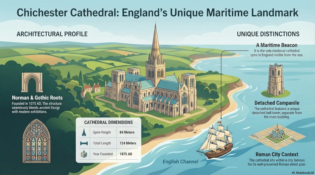 Chichester is a uniquely preserved Roman and medieval city in West Sussex. It is famous for its 12th-century cathedral, its world-renowned festival theatre, and its position as the only English city with a cathedral spire visible from the sea.
