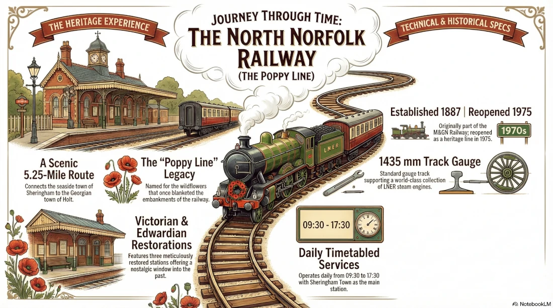 The North Norfolk Railway occupies a section of the former Midland & Great Northern Joint Railway (M&GN), which was once a vital link for the region's agriculture and tourism. Its nicknamed "The Poppy Line" because of the wildflowers that once blanketed the embankments. Today, it is a living history experience, featuring meticulously restored stations and a world-class collection of steam engines that offer a nostalgic window into the golden era of the English seaside holiday.